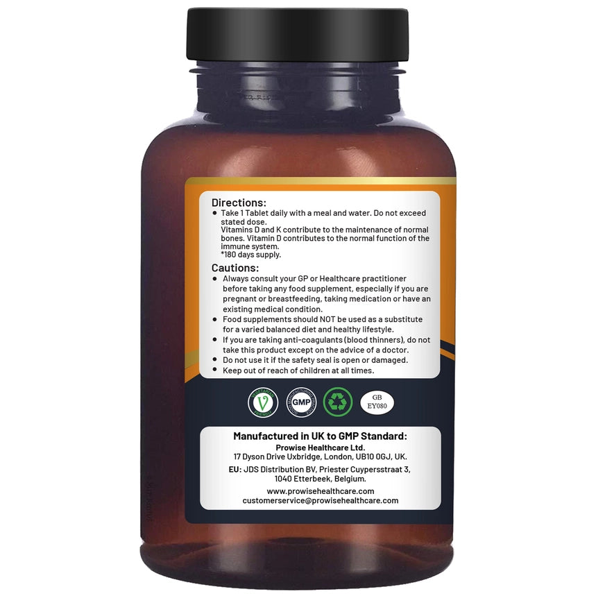 Ingredients: Bulking Agent (Dicalcium Phosphate, Macrocrystalline Cellulose), Vitamin D3 (Cholecalciferol), Vitamin K2 (MK-7), Anti-Caking Agents (Magnesium Stearate, Silicon Dioxide).